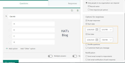 Nhiều thầy cô thắc mắc liệu trong Microsoft Forms có đặt giờ cho học sinh làm trắc nghiệm được không? Câu trả lời là có. Như hình sau:
